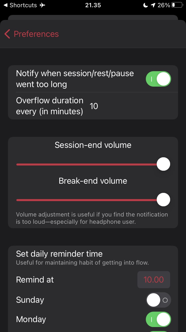 Preferences > Sound and notification > and Notify when session/rest/pause went too long.5-15 minutes. Experiment which one work best for you.Imagine having no distracting notifications while working on your iOS device. It's possible by turning on Do Not Disturb. Yes, you can turn it on manually when Session has started, but that's tedious. What if you can turn it on when you started your Session, and disable it after Session ends—all automatically?